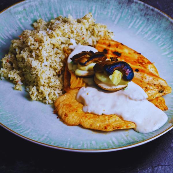 roston sült csirkemell sonkával, ananásszal, cheddar sajttal, rizzsel