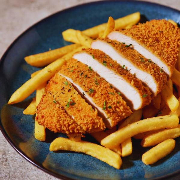 rántott csirkemell juhtúróval-baconnel-lilahagymával töltve, hasábburgonyával